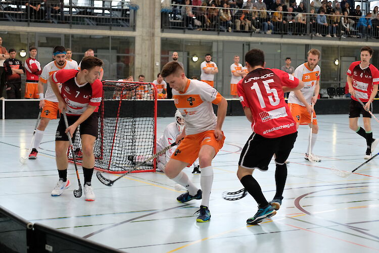 ULA startete in Unterzahl, verteidigte aber seriös und überstand die Strafe schadlos. In der 24. Minute passte Noel Schick präzise auf Tobias Steiner und dieser knallte den Ball unhaltbar ins Schwyzer Tor zum 3 – 0. ULA zwang die in gelb-orange spielenden Tuggener in der Folge zu Fehlpässen, eroberte in der Mittelzone viele Bälle und kam immer wieder zu gefährlichen Abschlüssen. Der Lauf der Oberaargauer wurde in der 26. Minute durch eine 2-Minuten-Strafe gegen Tobias Steiner wegen Stockschlag gebremst. Auch in Unterzahl kamen die Langenthaler zu Torchancen, verteidigten aber wieder gut, und nach einem Pfostenschuss der ULAner ging ein Raunen durch die Halle. Das Heimteam überstand auch diese Strafe und ging gleich wieder in sein tolles Kombinationsspiel über. Ein lauer Angriff von Tuggen-Reichenburg in der 30. Minute bescherte ihnen dann das 3 – 1; der Ball fand den Weg von hinter dem Tor in die Maschen. Schon kam wieder mehr Hektik auf, und die Gäste drückten ULA kurzzeitig in die eigene Hälfte zurück. Die Oberaargauer fingen sich wieder, mussten aber in der 35. Minute erneut in Unterzahl – Noel Schick wurde wegen Stockschlag in die Kühlbox geschickt. Dieses Mal liessen die Tuggener den Ball gut laufen und kamen in der 36. Minute zum Anschlusstreffer. Liessen sich die Langenthaler dadurch verunsichern oder vermochten sie den Druck erneut aufzubauen? Letzteres war der Fall; sie installierten sich sofort wieder in der gegnerischen Zone und kamen zu guten – wenn auch noch nicht zählbaren – Abschlüssen. Wieder kurz vor der Pause gab’s eine Strafe, dieses Mal gegen den UHC Tuggen-Reichenburg; eine gute Gelegenheit für ULA, den Zweitore-Vorsprung wieder herzustellen. Bis zur Pause blieb es aber erstmals beim 3 – 2.