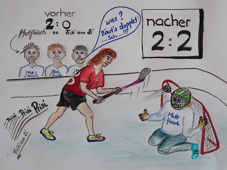 «Prisi, Prisi, Prisi» so ertönte es von der ULA Bank. Uns war schon bewusst, dass dies unsere letzte Chance blieb. Die gefoulte ULAnerin setzte sich den Ball, schaute dem Goalie so fest in die Augen das dieser am liebsten in die Garderobe geflüchtet wäre, und nahm Anlauf. Hochkonzentriert zirkelte Prisi den Ball torwärts, liess den Goalie gekonnt aussteigen und versenkte trocken ins obere linke Eck. Zwei jubelnde Teams, «Friti am 8i» natürlich aufgrund des herrlichen Frauen-Power Tores, die «Mettfleischer», weil sie dachten, dass sie nun 2:1 gewonnen hätten. Die Mettfleischer machten grosse Augen, denn Ihnen war wohl zu diesem Zeitpunkt nicht bewusst, dass Frauentore doppelt zählen. Dieser eine versenkte Penalty wendete das Spiel und liess es 2:2 enden.